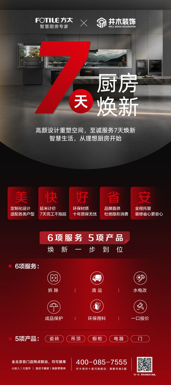 传统厨房改造报价复杂,隐含增项多。井木装饰与方太集团整合双方供应链优势资源,为消费者提供涵盖“拆除、清运、水电改、成品保护、环保用料、一口报价”6项服务及“瓷砖、吊顶、橱柜、电器、门”5项产品,在保障高端品质的同时,实现更具竞争力的整体价格。