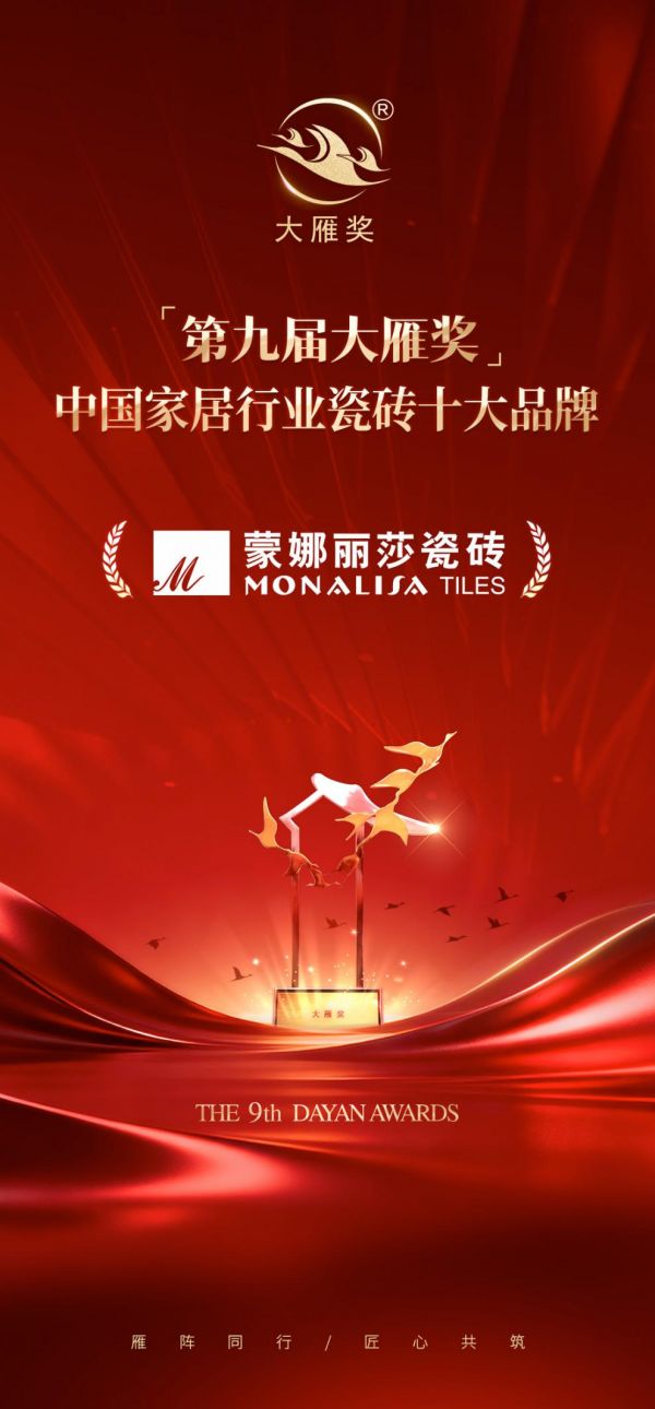 首屈一指|蒙娜丽莎荣膺「第九届大雁奖·中国家居行业瓷砖十大品牌」奖项