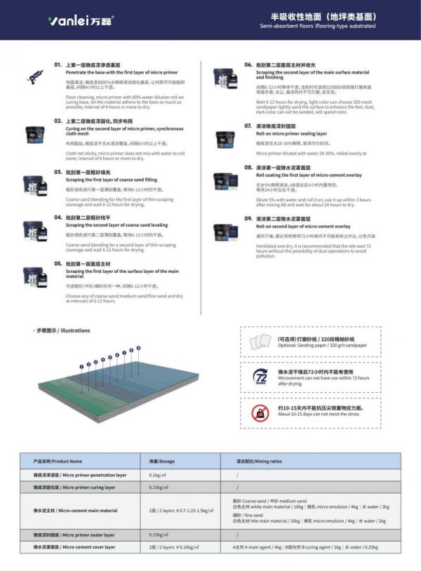层间间隔:底漆、微水泥层、面漆之间必须保证6-8小时或24小时间隔
