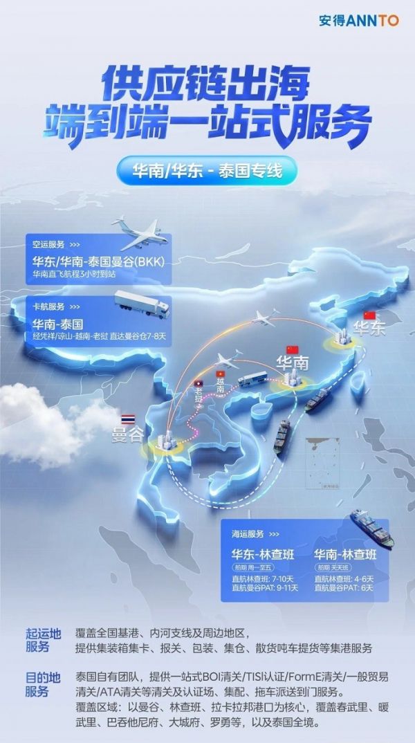 泰国作为东南亚制造与贸易的关键枢纽,正吸引越来越多中国制造企业布局投资。然而,跨境物流中报关复杂、流程不透明、末端配送难等痛点,常使企业面临供应链效率不足与运营风险。安得智联基于多年服务制造企业的经验与泰国本土化能力,正式推出“华南/华东—泰国”端到端专线,为企业提供涵盖报关、运输、仓储、配送的一站式供应链解决方案。