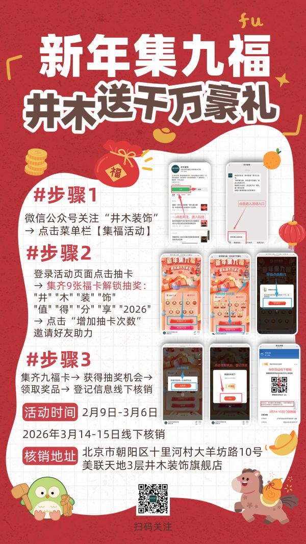 井木装饰希望通过这样的形式,传递“值得分享”的品牌精神,让每一位参与者在集福、赢礼的过程中,感受到新春的喜庆与品牌的温度。未来,井木装饰将继续以客户需求为核心,融合设计、工艺与服务,为更多家庭提供整体家居解决方案。