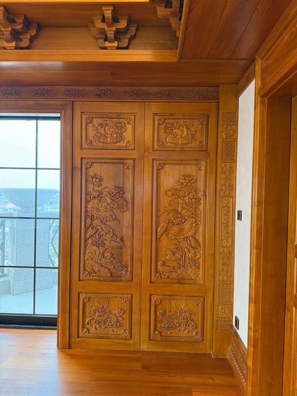 门扇与护墙雕刻:卧室门扇、护墙板以牡丹、莲花、兰草、花鸟等吉祥图案为主题,采用对称式构图,浮雕层次分明 —— 牡丹寓意 “富贵吉祥”,莲花象征 “清廉高洁”,花鸟则传递 “生机盎然”,既蕴含美好期许,又通过细腻刀工让静态木作充满生命力。
