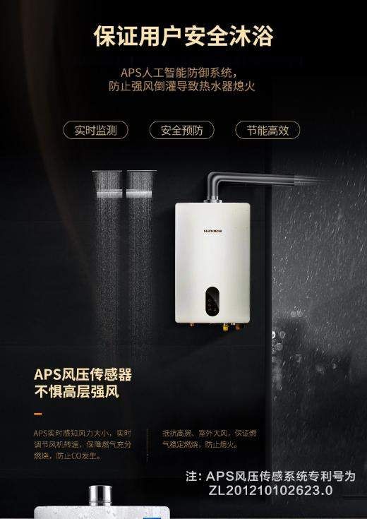 作为核心技术,庆东纳碧安为NGW570配备的APS风压传感系统拥有国家专利(专利号:ZL201210102623.0),搭载的高精度风压传感器能实时感知室外风力与烟道风压变化,智能调节风机转速:遇高层强风、台风等极端风压时,风机自动增压,有效抵御强风倒灌,保证燃气与空气最佳混合比例;即便感知到燃烧不充分前兆,系统会立即补正风量,合理分配供氧量,确保燃气充分燃烧,从根源减少CO产生。同时该系统具备CO强力抽排功能,若出现少量未充分燃烧的CO,风机将加大抽排力度快速排出室外,杜绝回流隐患,经实测可抵御12级台风,完美解决高层风压痛点。
