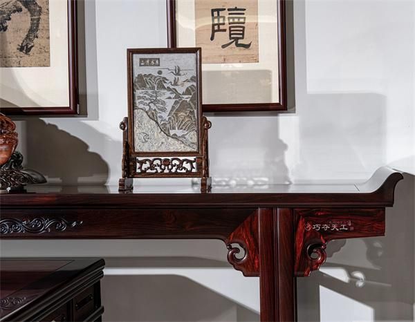 条案案面两端设翘头,线条挺括而不僵硬、柔和而不纤弱;案面下牙条正中雕刻双龙纹,卷云纹的牙头,寓意吉祥如意。