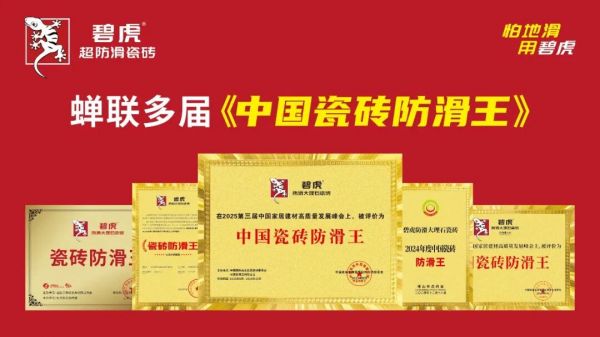 碧虎超防滑瓷砖六度蝉联【中国瓷砖防滑王】,荣获多项防滑发明专利,斩获【广东陶瓷头部品牌】、【防滑瓷砖销量冠军】、新华社【了不起的国货】、工信部【科学技术成果登记证书】、【陶瓷行业新一线品牌】等多项重磅荣誉;并作为超防滑瓷砖团体标准首席起草单位,主导制定【超防滑瓷砖制备技术规范】,引领行业规范升级。
