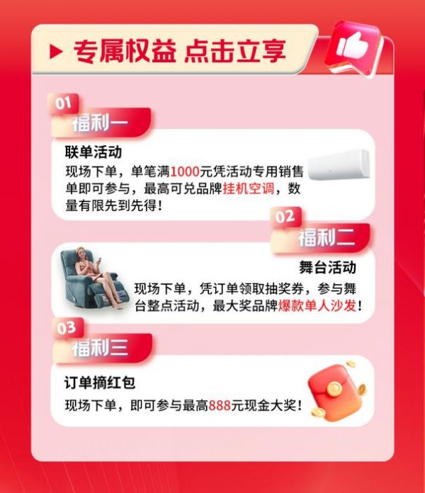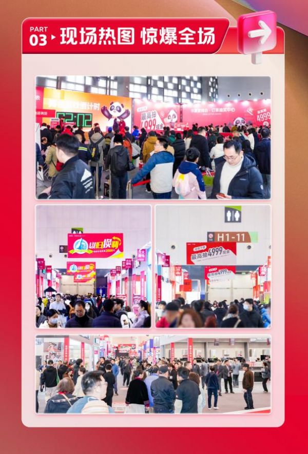展会现场福利不间断,联单兑礼、舞台整点抽奖、订单摘红包等惊喜轮番上演,最高可抽4999元现金大奖,逛展不仅能采购心仪的家装好物,更能满载而归!