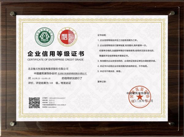 集团自2022年来连续四年蝉联中国建筑装饰协会家装五星级信用企业,以及CBDA标准实施单位,海天恒基装饰集团始终坚持以“致良知”为企业文化内核,积极履行大型装企的行业责任,助推家装市场规范化、品质化发展。依托31年深耕经验,集团持续推动设计与交付能力的系统迭代,围绕“零焦虑家装体验”构建全链条服务闭环。