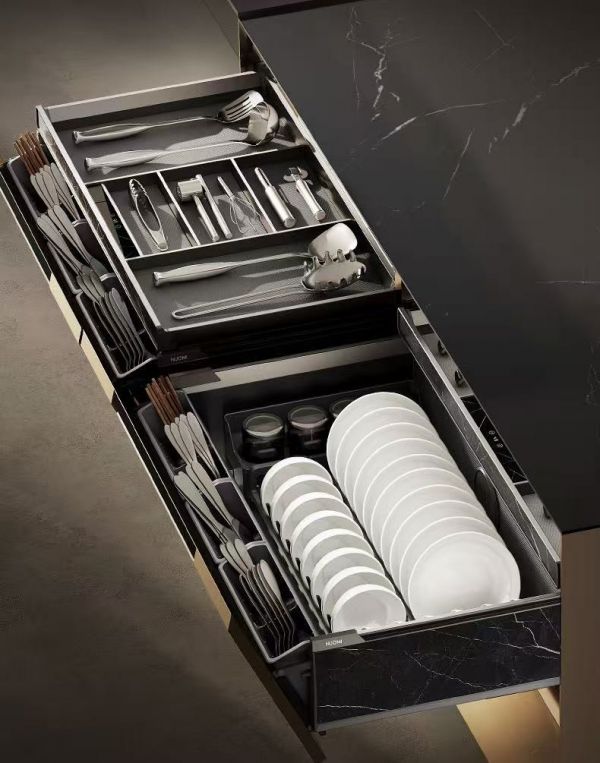 智能消杀碗碟拉篮:采用智能电动升降设计,搭载等离子杀菌、65℃恒温烘干与仿生超声驱虫功能,采用多模式智能巡航消杀,内部搭配下沉式扩容区与太空舱碗碟架,子母联动全抽结构,产品选用加厚不锈钢珠花板与氟碳喷涂工艺,坚固耐用、防腐易清洁,搭配优质导轨,通过长时间开合测试,承重力强,兼具美观与实用性,提升厨房使用体验。