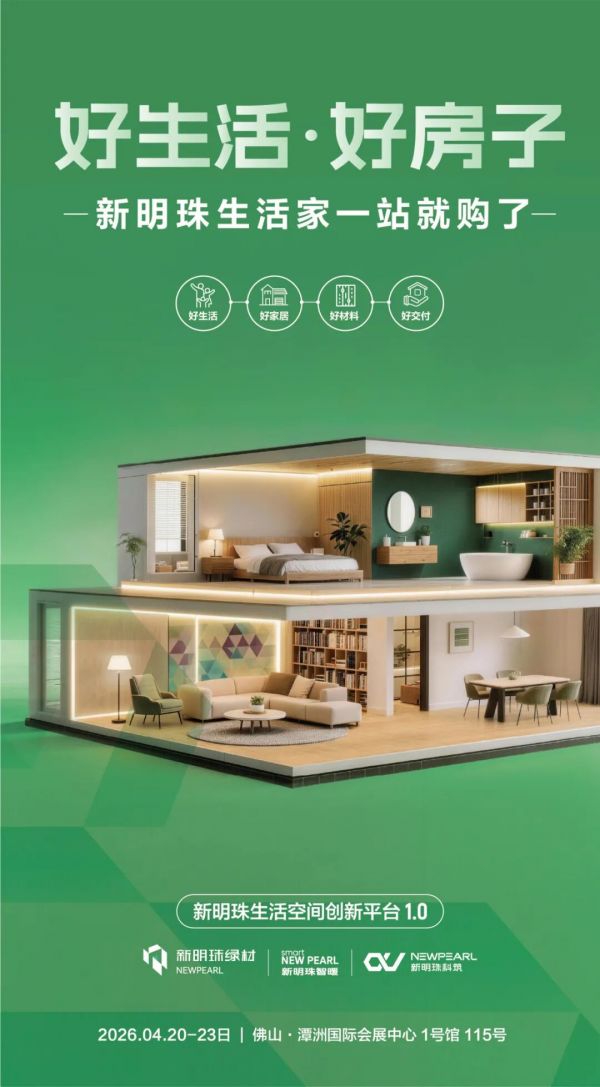 4月20-23日,佛山潭洲国际会展中心1号馆115号,新明珠绿材将以 “好生活 好房子——新明珠生活家一站就购了” 为主题,携装配式技术、绿色材料矩阵、全场景解决方案等亮点强势亮相2026佛山潭洲展。