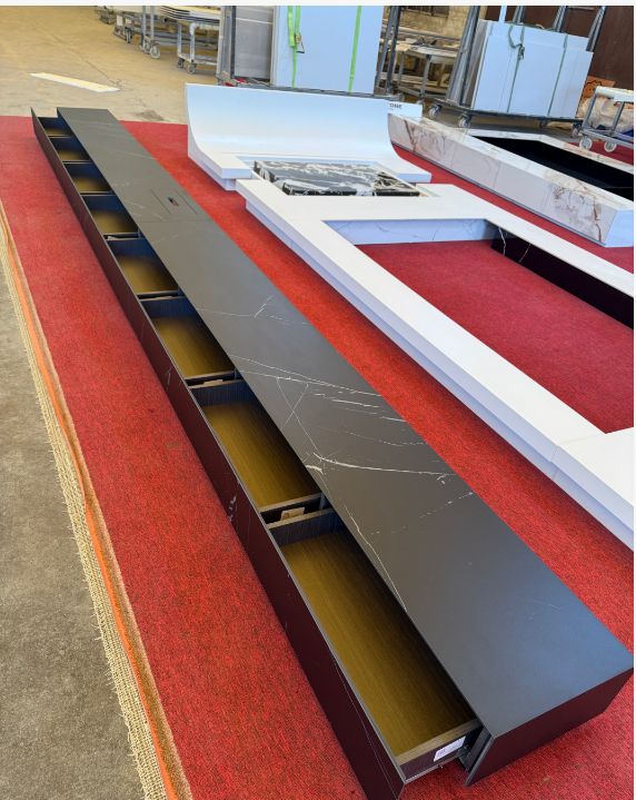 谢甫青说只做实实在在的定制加工,不做自有品牌销售,可以覆盖918到1.8m×3.2m全规格岩板加工,承接异形岛台、餐台面、餐边柜、楼梯踏步、厨房台面复合蜂窝铝等各类定制。