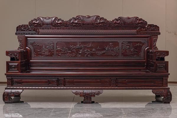 古森红木产品《祥云沙发》,雕刻纹样寓意仕途顺遂、胸襟开阔