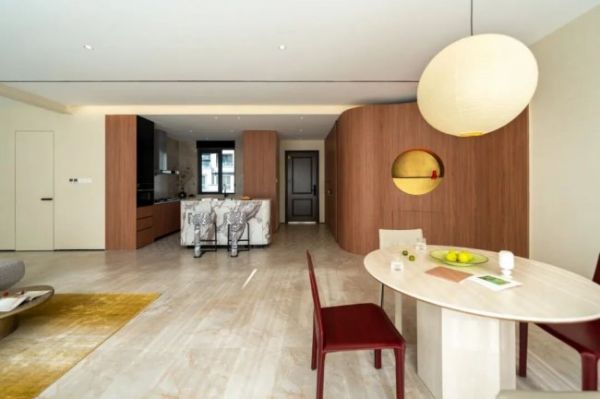 无论是光脚踩在地面肆意踱步,还是随性席地而坐享受独处时光,都能感受到源于旷野的温柔包裹,让日常琐碎都化作度假般的松弛惬意。连贯的砖面纹理让整个公区浑然一体,既包容着家人之间的亲密互动,也能安放独处时的宁静沉思。