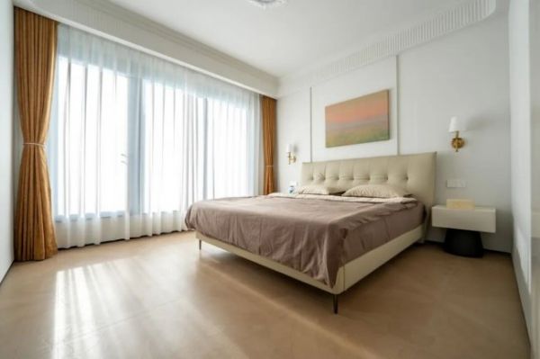慢生活的终极内核,是拥有一处能彻底卸下疲惫、疗愈身心的休憩空间。卧室以素雅静谧为核心基调,摒弃冗余装饰,地面通铺萨米特「木里系列」茜草砂木纹砖。