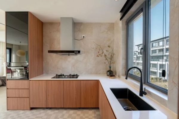 厨房地面采用了「1492·石语系列」的变奏,营造出自由随性的生活氛围。宽大的岛台成为家庭互动的核心,烹饪不再是琐碎家务,而是家人情感交融的温馨时刻。厨房墙面则延续了客厅的巴尔颜瓷砖,无论是地面还是墙面,这款产品都能很好融入。
