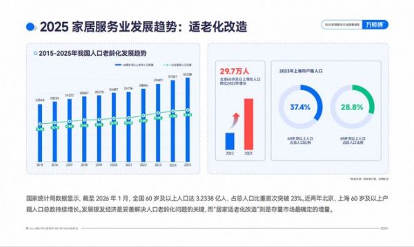 据国家统计局数据,截至2026年1月,全国60岁及以上人口达3.2338亿人,占总人口比重首次突破23%。同时,调研结果显示,近两年北京、上海60岁及以上户籍人口总数持续增长。