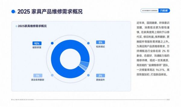 报告显示,92%家具维修需求来源于破损修复。保养翻新、更换配件等服务需求逐年上升。