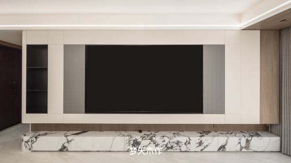 客厅气韵通透,视野开阔。电视收纳柜以温润木质为主体,采用嵌入式设计巧妙容纳大尺寸电视;底部衬以优雅的大理石花色地台,一旁点缀的金属开放格,在深浅有致的色彩搭配中,勾勒出和谐而丰富的立体感。
