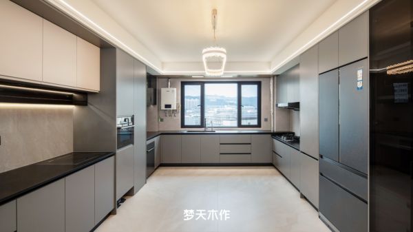 拉开铝合金玻璃移门组,步入式厨房空间感豁然开朗。大面积的灰调渲染出冷静轻奢的底调。整体橱柜采用免拉手设计,并将烤箱、冰箱等家电完美嵌入,线条平整利落,极大强化了空间的整体性与秩序感。