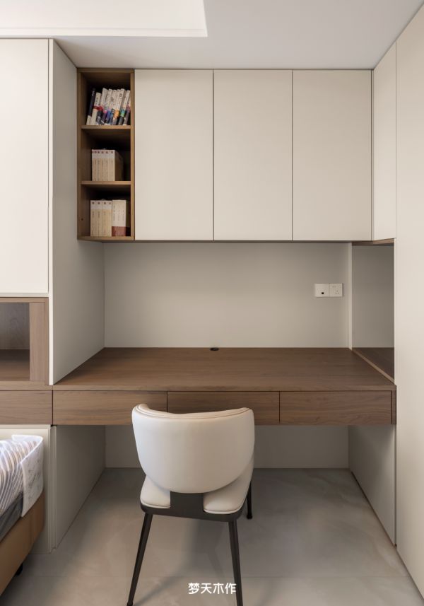 卧室的每一处设计,都是对空间形态的精准回应。依墙定制的悬浮式书桌与收纳柜,不仅功能强大,其轻盈的体态更成为空间美学的一部分。