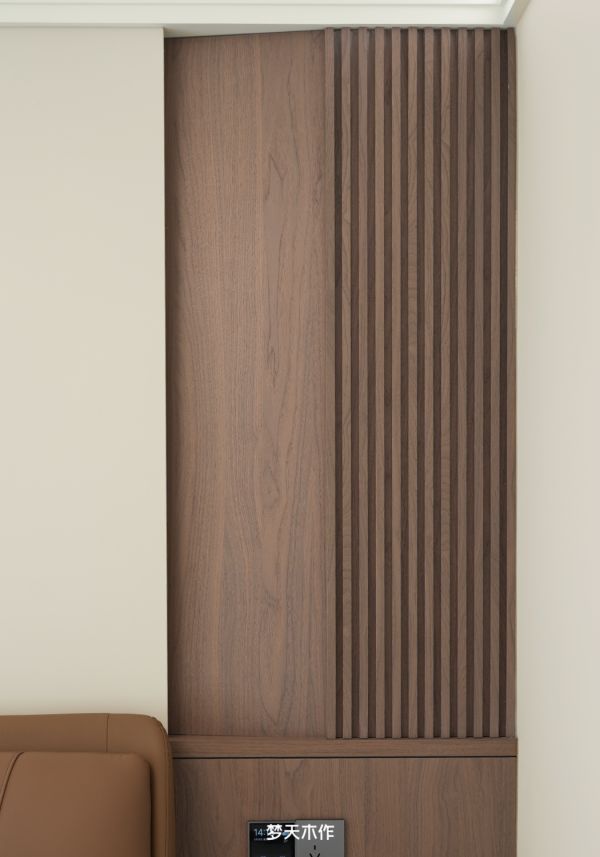 视觉焦点——床头背景墙,运用斜切与纵横板的组合设计,以独特的几何构图解构立面,赋予空间深刻的建筑感与不言而喻的轻奢格调。