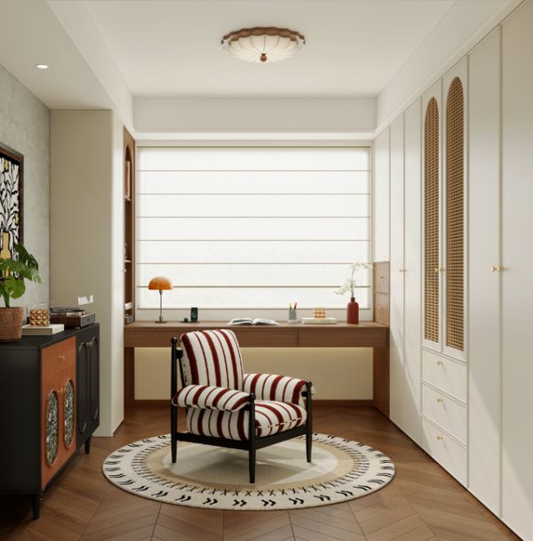 衣帽间与书房一体化,实现一房多用。整墙定制柜收纳力拉满,靠窗整排书桌确保采光与实用性双在线。复古条纹单椅,让阅读时光慵懒自在。