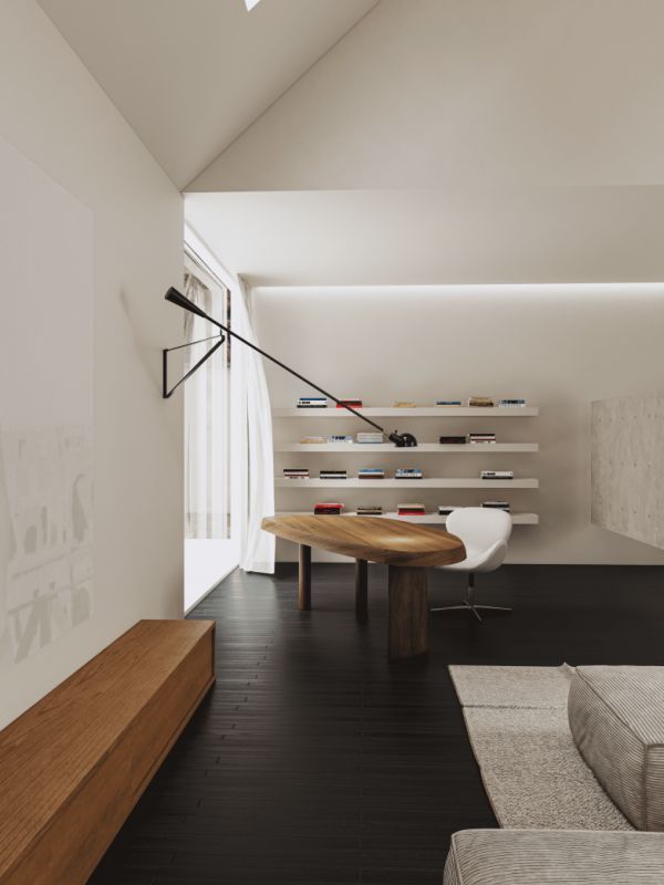 我们采用了极简主义的设计风格。你会发现,空间里没有多余的装饰,所有的美感都源于建筑本身的骨架——斜屋顶带来的高挑感、大面积的留白,以及自然光的介入。我们试图在“空”与“实”之间找到一种平衡,让居住者在这里能感受到一种流动的静谧。