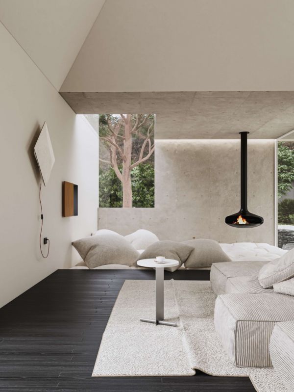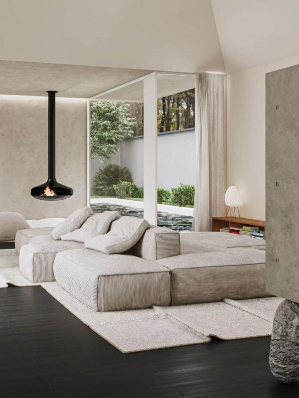 Ruth: 它是这个家的“心脏”。传统的客厅往往围绕电视布置,但我们希望打破这种陈规。这盏黑色的悬挂壁炉像是一个现代装置艺术,它不仅解决了取暖的物理需求,更营造了一个围炉而坐的情感中心。火焰的动感与周围素雅、静止的混凝土墙面形成鲜明对比,赋予了空间一种原始的生命力。