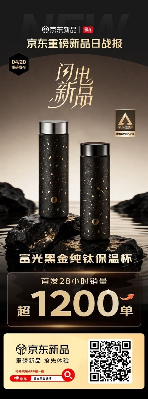随着消费者对饮水健康与生活品质关注持续升温,“钛”材质凭借安全、轻盈、不串味优势,正成为水具行业最具增长潜力的细分赛道。近日,京东携手富光打造的“闪电新品”黑金纯钛保温杯在京东独家首发,上线28小时销量即超1200单,登顶保温杯、钛杯双品类TOP1,创下钛杯新品首发销售纪录,以亮眼成绩印证“健康钛时代”消费风潮的到来。