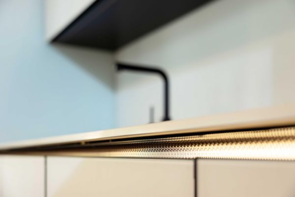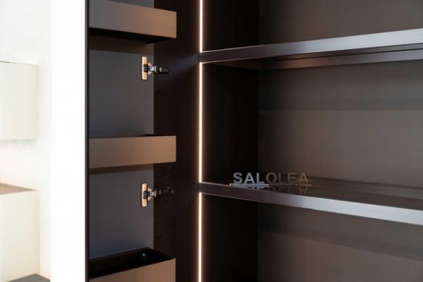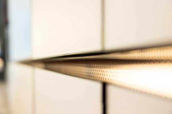 Andrea:我们把这套哲学称为“被稀释的物质性”——让金属材质呈现轻盈、悬浮、近乎无形的状态。悬浮式结构设计让柜体如漂浮于地面之上;极致纤薄将台面与门板的厚度压缩至视觉极限;光的介入则在柜体底部和背部嵌入光带,光线“吃掉”阴影,厚重感随之消解。