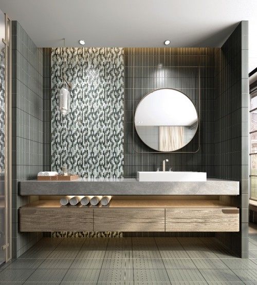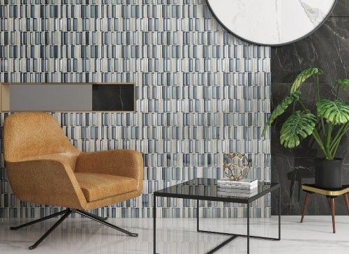 混合材质的马赛克具有极强的环境渲染力,大片铺贴可以轻松做出艺术背景墙的效果,而且其丰富的花纹、光泽变化,能够在保持简约的基调下增强层次感。
