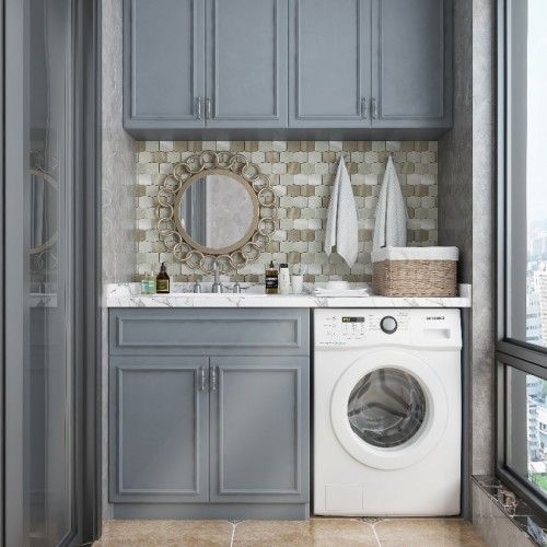 马赛克本身就具有很强的艺术装饰效果,譬如这个案例就使用了几何设计的马赛克作为盥洗台背景墙,线条化的马赛克花纹,为整个空间增添了繁复的动感,更显个性。