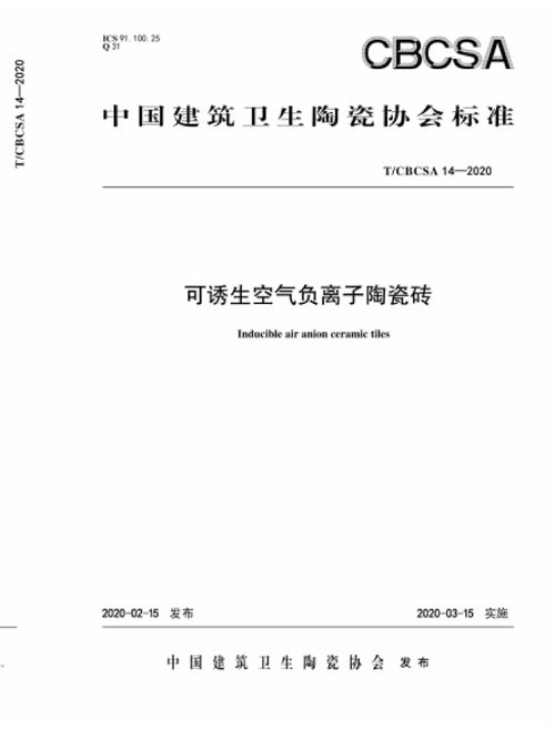 从“大乱”到“大治”,负离子瓷砖逐步走向规范化发展的另一个标志性事件是,2020年2月15日,经过相关研究单位两年时间的潜心研究和无数次试验测试,中国建筑卫生陶瓷协会正式发布了针对负离子瓷砖的协会团体标准《可诱生空气负离子陶瓷砖》(T/CBCSA 14—2020)。该标准规定了可诱生空气负离子陶瓷砖的术语和定义、分类、技术要求、试验方法、检验规则、标记和说明、包装、运输、贮存等事项。