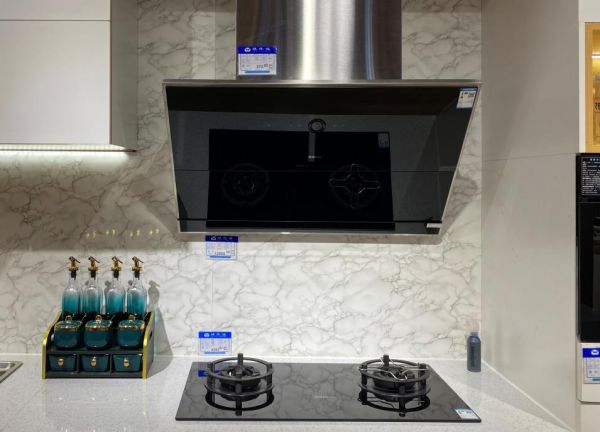 从外观看,这套组合颜值超高,烟机表面的击光环设计格外增加科技感。店长介绍道:“这款油烟机吸力大,即便在开放的西式厨房也能将油烟吸干净。”