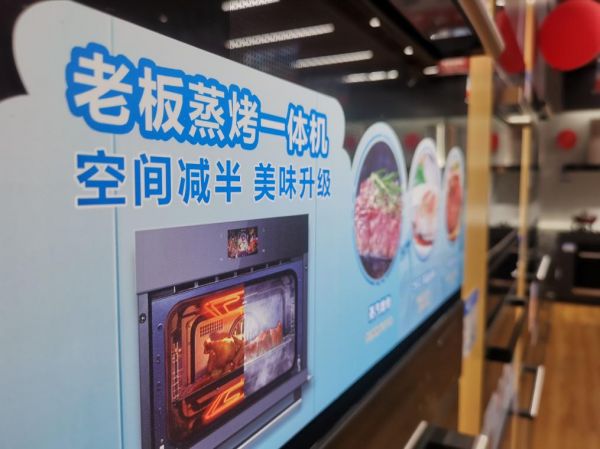 据了解,作为致力于创造中国新厨房的厨电品牌,老板电器的厨电产品已经从功能单一的1.0时代(以吸油烟机、灶具为代表)升级到复合功能4.0时代(包括吸油烟机、灶具、蒸烤一体机、洗碗机的 4件套组合),直接针对厨房痛点及现代人群的生活习惯、生活方式进行升级改造。在探店当天,小编见到了其中的3件套:油烟机、灶具、蒸烤一体机。