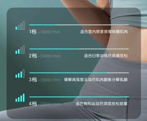 针对身体肌肉受力不同的特征,荆棘草特设置了4挡选择,搭配上球形、平扁、U型及锥形4款按摩头,一个人在家也能享受全身SPA。第1档1800r/min,最温和的档位,对于新手极为友好,适用于室内日常按摩放松;第2档2400r/min:作为日常训练后筋膜放松,适合于偶尔的运动爬山人群,消除肌肉酸痛;第3档2800r/min:可用于高强度运动后肌肉酸胀分解乳酸,摆脱肌肉腿第4档3200r/min:最强劲的档位,适合专业级运动员用于深层次肌群按摩,新手不建议使用这个档位;