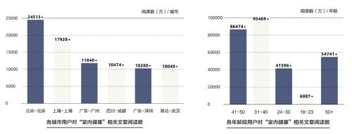 值得关注的是,男性相较于女性更关注室内健康问题,前者对“室内健康”相关文章的阅读数超过 21 亿,是后者的近 3 倍。这似乎与惯常印象相悖,我们往往认为,在家庭中女性更关注家居生活的健康、舒适等问题。