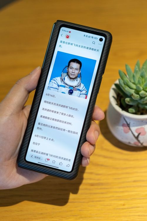首先是外观部分,初次上手的感觉就是很细长,考虑到便捷性单手握持时贴合手掌,就算小编这样较小的手型也能轻松握持,闭合状态下的小米MIX FOLD更像是为了日常简单使用,看看时间,接打电话等等,在浏览腾讯新闻这种资讯类APP时观感也不错,应用程序能够自适应展开、闭合状态,自动切换显示界面,满足任何场景需求。