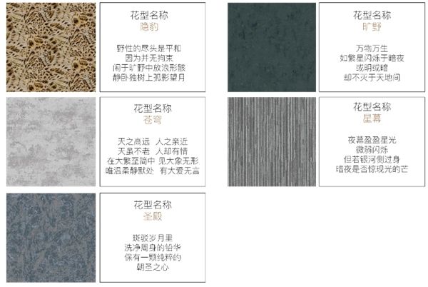 本次系列收录了隐豹、苍穹、圣殿、旷野、星幕等五种花型设计,从大自然中汲取灵感,打造出独一无二带有力量的花型。