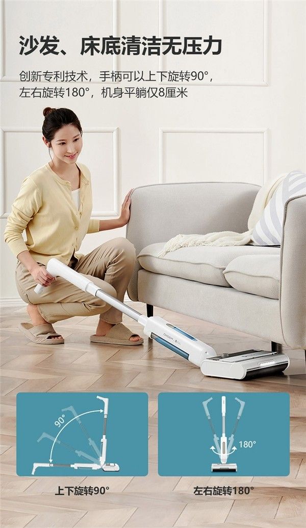 首先在使用的时候,滴水洗地机仅重3.5kg,而且还自带牵引力,父母仅需控制方向即可,而且床底下、沙发下等低矮场景,一般的洗地机和吸尘器由于技术和体积限制做不到平躺清理,但是滴水洗地机最大程度可以上下90°、左右180°旋转。