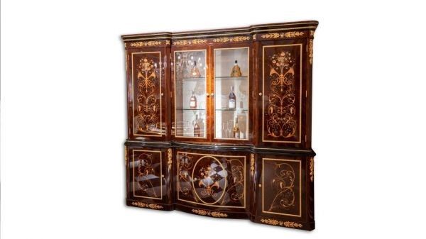 比如品牌欧罗巴的这款欧式古典四门酒柜,表皮的装饰图案由天然贝壳和木皮镶嵌拼接而成,搭配高品质钢琴漆面,给人一种奢华大气之感,容易讨长辈喜欢。