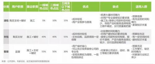 大多数竞争者升级成了前端以互联网入口获客,后端以装修公司各自为战的模式。因此,互联网家装的深度体验未有整体性的提升。目前有两种模式,一种是平台模式,平台扮演的角色主要是为各种线下装修公司引流,另一种就是爱空间这样的垂直类家装模式,对于整个装修周期实现了更强的把控,用户体验从传统的“清包、半包”替换为“一站式全包”服务。