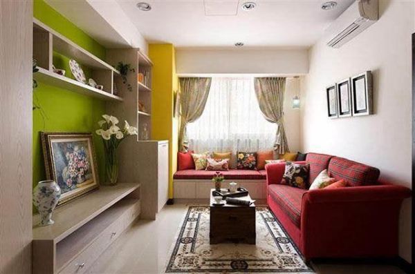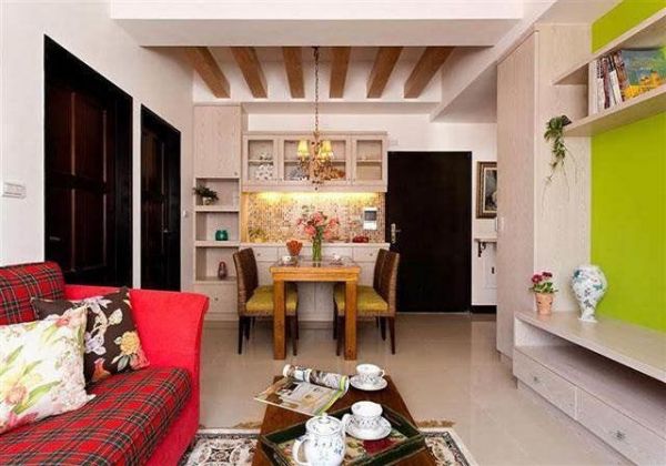 开放式的客餐厅,客厅的面积不大,而且还是分隔成两个功能区域了,所以显得很紧凑。唯一不足的地方就是感觉色彩运用得太多了,有白色,绿色,还有红色,是不是感觉有点杂啊?搭配不是特别协调,你觉得呢?