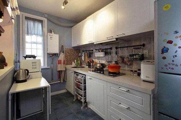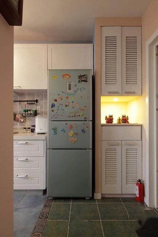 厨房吊柜和地柜都装了,嵌入式的冰箱,超级节省空间,而且也特别实用,整体以白色为主,显得简约大气。