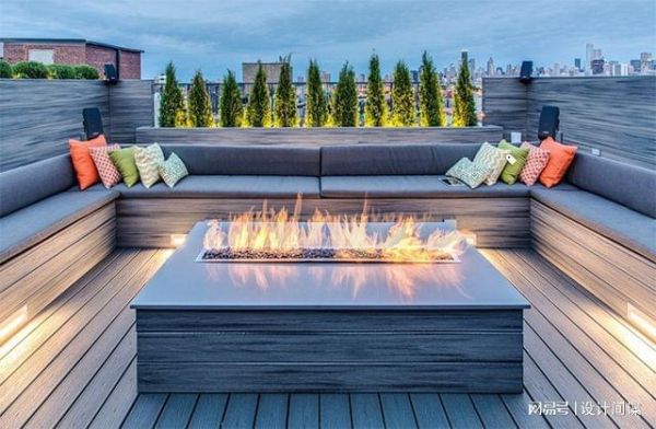 庭院中用灰色防腐木搭成地台,布置了沙发休息椅,餐桌餐椅等