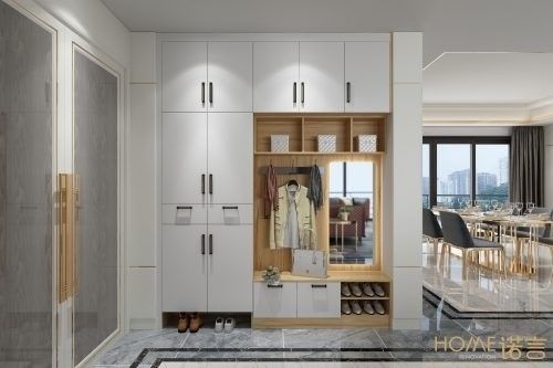 玄关占据了房屋的一部分面积,将玄关和鞋柜组合在一起,不仅美观,而且可以节省空间,增加储物量。毕竟小户型的房子不适合做隔断,要想节省空间,玄关+鞋柜的组合最实用。
