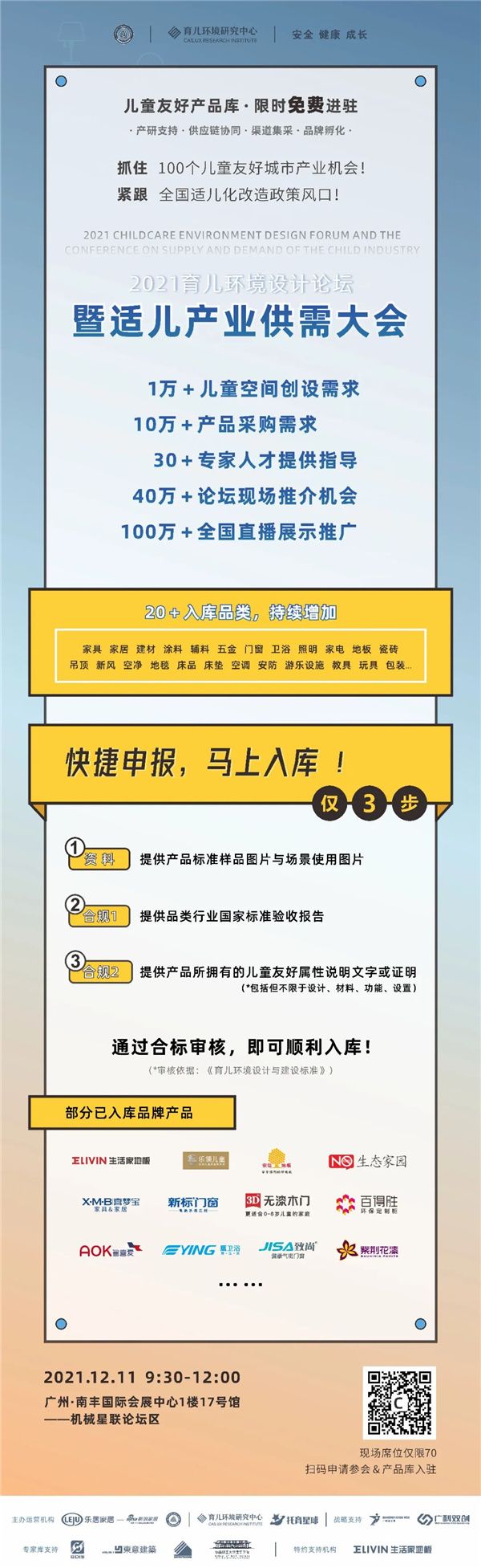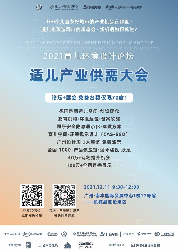 这些疑问与讨论,将在由广东省采购与供应链协会|育儿环境研究中心、新浪家居、托育星球联合主办的“2021育儿环境设计论坛·暨适儿产业供需大会”上得到释疑。本次大会是2021广州设计周引入的系列主题活动,于12月11日上午9:00-12:00在广州·南丰国际会展中心1楼17号馆·机械星联论坛区举办。这次大会将延续“安全·健康·成长”的育儿环境设计论坛主旨,在过往的设计建设、研究、制造业代表外,增加邀请多家托育、幼儿园、教育空间的采购者、经营者、投资者参会,引入他们的观点、痛点与需求,助推供需对接。让消费端指导供应链质量标准提升,让终端市场驱动新技术、新工艺、新材料、新方法的研制。