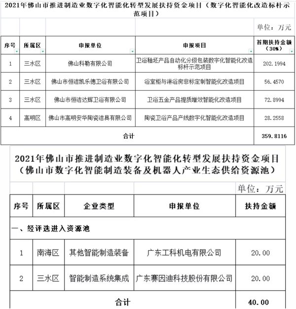 12月6日,佛山市工业和信息化局公示了2021年佛山市推进制造业数字化智能化转型发展扶持资金(智能制造和机器人产业有关部分)拟支持项目名单。扶持项目分为数字化智能化改造标杆示范项目、数字化智能制造装备及机器人产业生态供给资源池、机器人制造和系统集成骨干企业三类,共计71个企业入选。其中,6家卫浴及陶瓷装备企业入选,将获扶持资金399.8116万元。