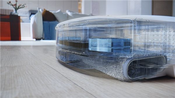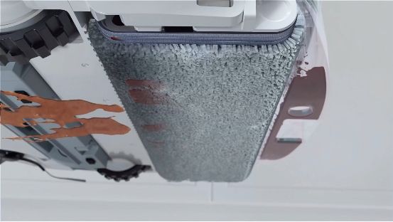 机身的拖布清洁系统由清水、污水盒和污水回收装置组成。清水喷洒地面溶解污渍,污水回收装置将拖布上的脏污回收至污水盒,高速反转每分钟可清洗拖布90次,保证脏污实时回收,避免二次污染。
