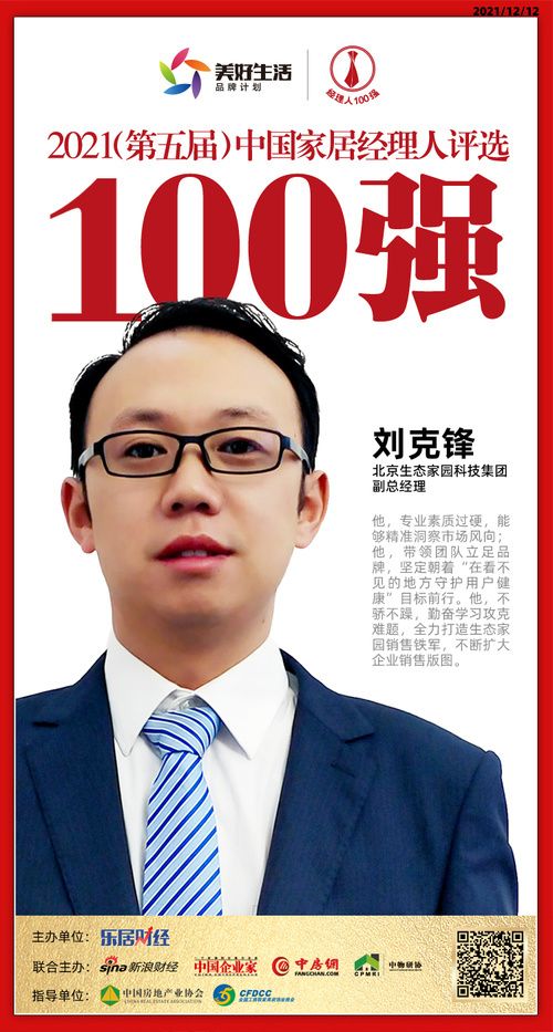新浪家居12月12日,2021(第五届)中国地产新时代盛典在北京举行,“2021中国家居经理人100强”榜单正式揭晓。北京生态家园科技集团副总经理刘克锋荣获“2021中国家居经理人100强”。