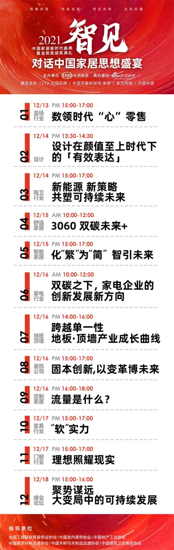 由乐居家居、新浪家居主办,CCTV•大国品牌、中国质量新闻网•家居、家页传媒、大国中居协办,全国工商联家具装饰业协会、中国室内装饰协会、中国林产工业协会、中国建筑材料流通协会、中国木材与木制品流通协会、中国建筑卫生陶瓷协会、广东省家居业联合会共同指导的《智见•2021中国家居新时代盛典暨金致奖颁奖典礼》——「对话中国家居思想盛宴」将于12月13日正式开启。